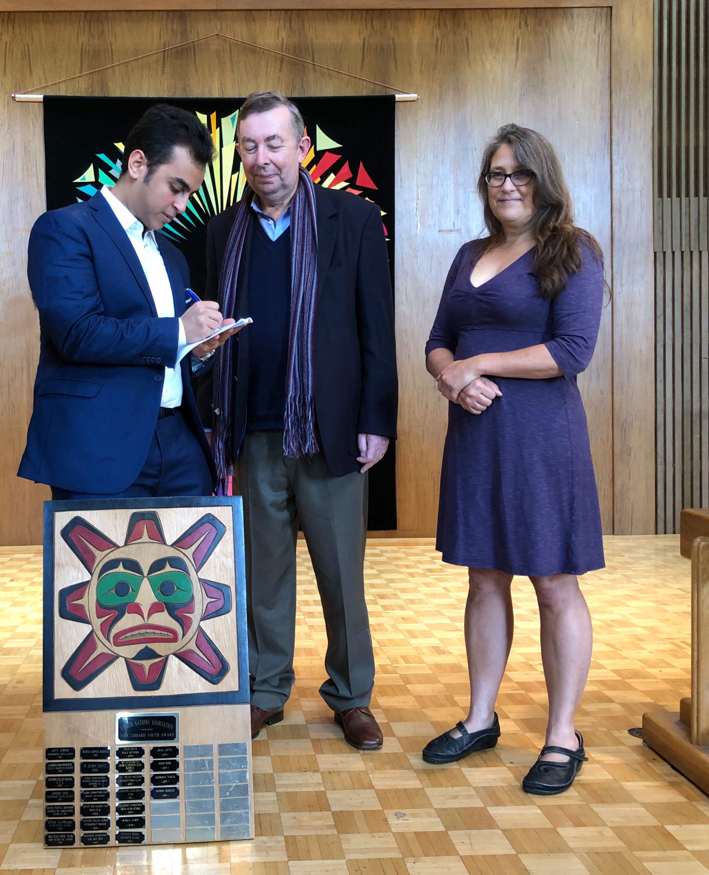 George_Andrew_Tascha_2018 Next → George Somerwill, Past President of UNAC Vancouver, introducing Andrew Sheroubi at the 2018 John Gibbard Award event at the Unitarian Church.